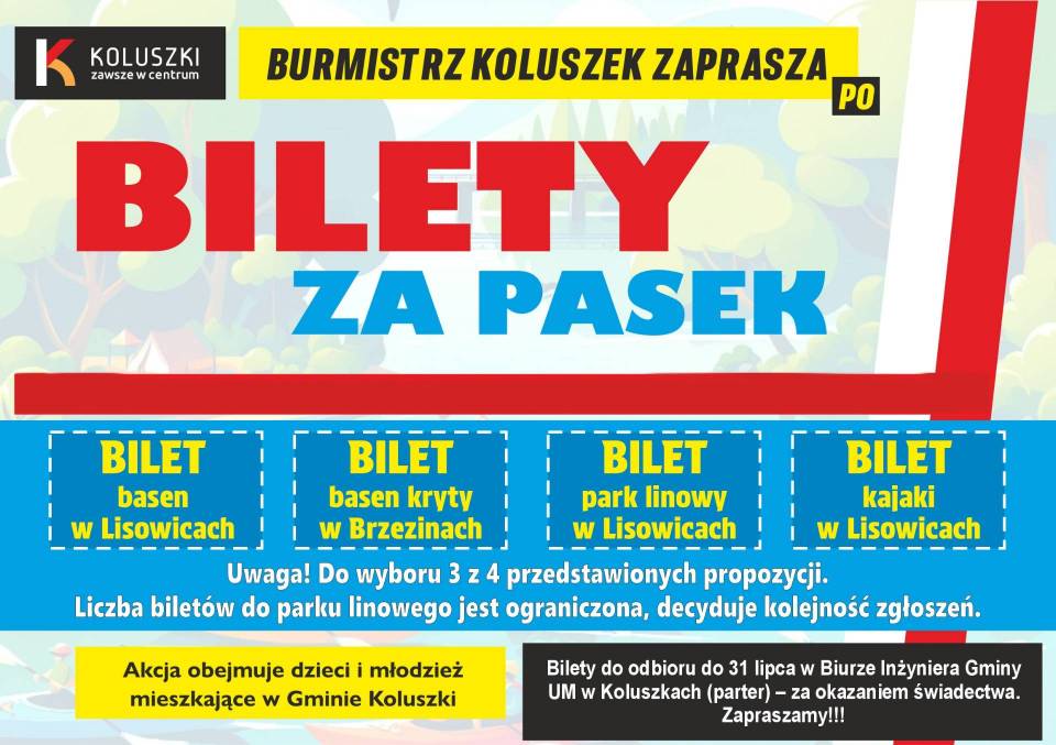 Gdzie i kiedy odebrać bilety?Wejściówki można odbierać do 31 lipca w Biurze Inżyniera Gminy (parter Urzędu Miejskiego w Koluszkach), okazując świadectwo szkolne z paskiem.
