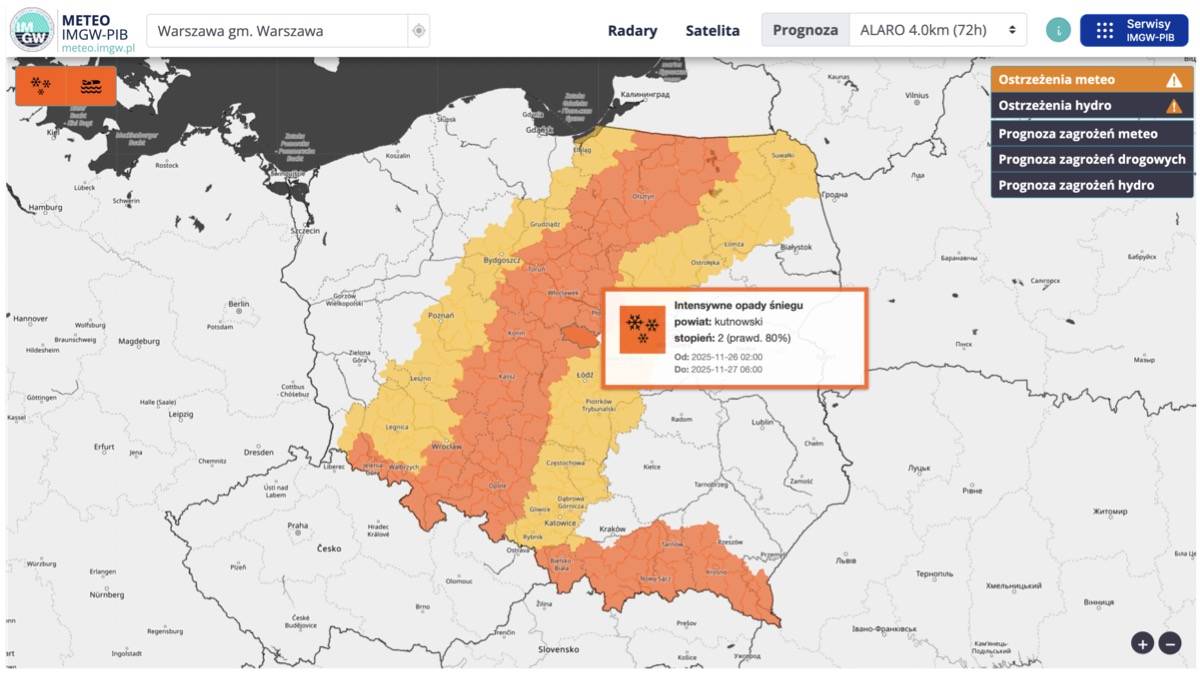 Pierwsze ostrzeżenie, niższego - I stopnia, obowiązuje od godziny 8.00 w środę 26 listopada do północy tego samego dnia. Obejmuje ono m.in. Łódź, Skierniewice, Piotrków Trybunalski oraz powiaty: bełchatowski, brzeziński, łaski, łowicki, łódzki wschodni, opoczyński, pabianicki, pajęczański, piotrkowski, radomszczański, rawski, skierniewicki, tomaszowski, zduńskowolski i zgierski.